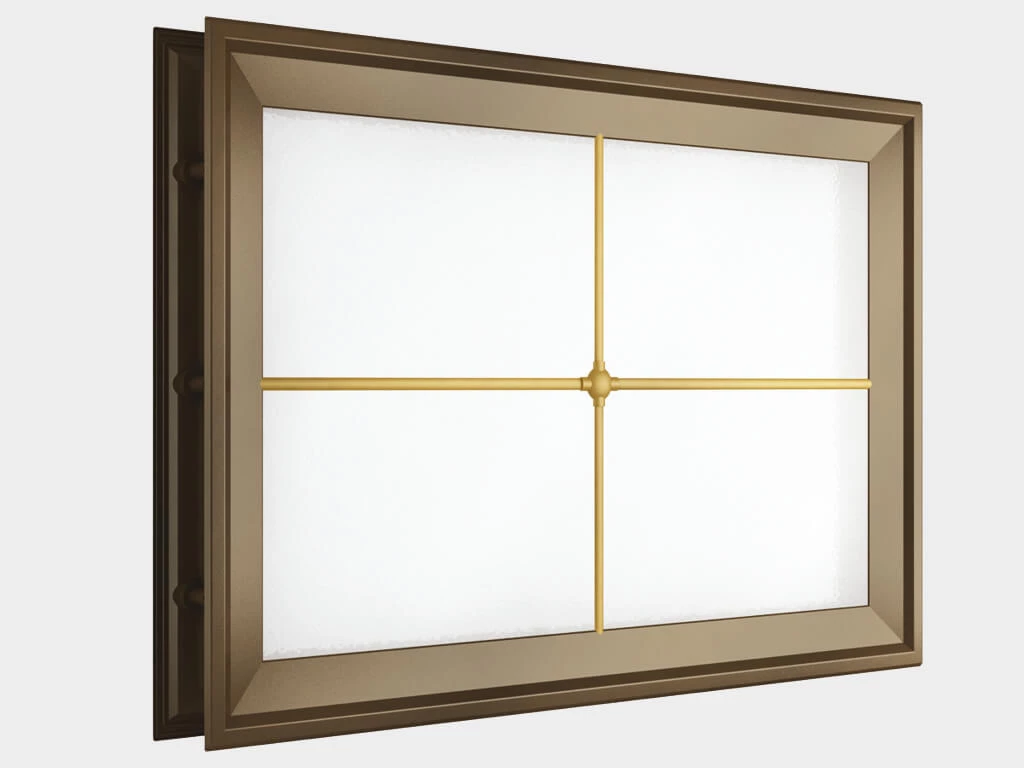 Окно акриловое 452 × 302, коричневое с раскладкой «крест» (арт. DH85628). Специальная конструкция обеспечивает плотное прилегание к полотну ворот, что защищает его от промерзания и теплопотери. Стилистическая вставка в форме креста. Окантовка коричневого цвета.